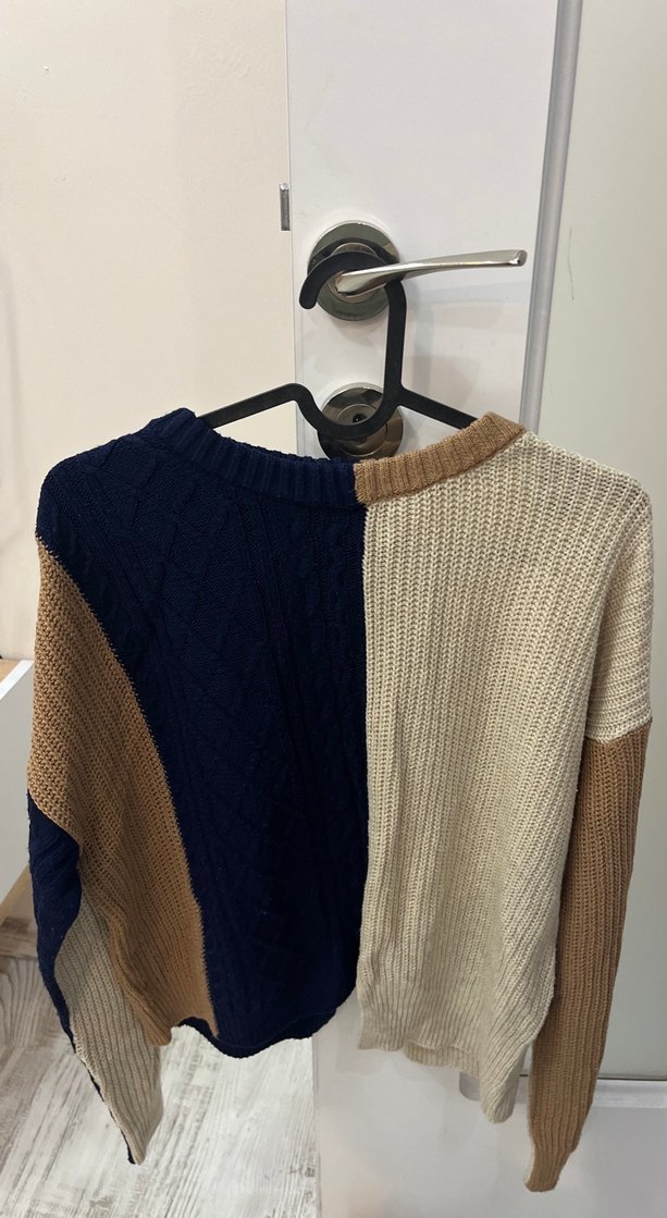 Kadınlar için rahat kesim, uzun kollu ve bisiklet yaka kazak. Koyu kahverengi, lacivert ve bej renklerde renk bloklu triko örme kazak.