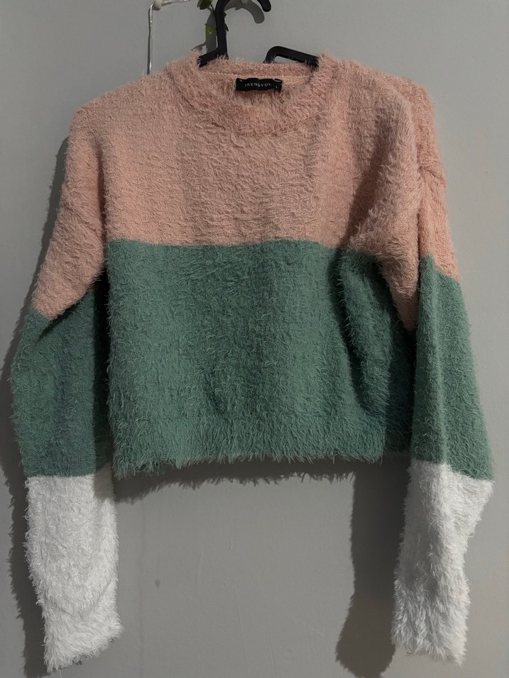 Rahat kesim, uzun kollu, yuvarlak yaka kadın kazak. Yumuşak triko dokusu ve pastel renk bloklarıyla günlük kullanıma uygundur. Çok yumuşak çok tatlış bi kazak birkaç kere giyildi deformitesi yok