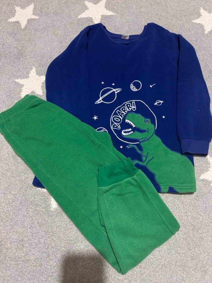 Rahat kesim, uzun kollu ve bisiklet yaka erkek çocuk polar pijama takımı, renkli dinozor baskılı. Örme kumaştan rahat kullanım sağlar.