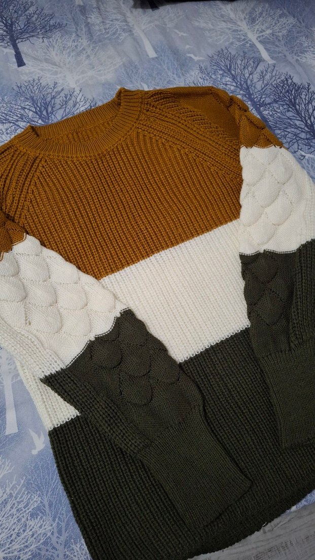 Kahverengi, beyaz ve haki yeşil renk bloklarından oluşan yumuşak dokulu kumaştadır. beden M fakat S ve L bedene de uyumludur