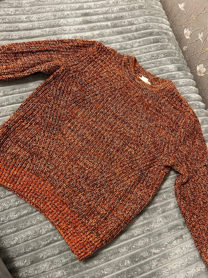 Renkli kahverengi örgü kumaştan, rahat kesim, uzun kollu, bisiklet yaka ve midi uzunlukta bir kazak. Trendy sokak stili için uygundur.
