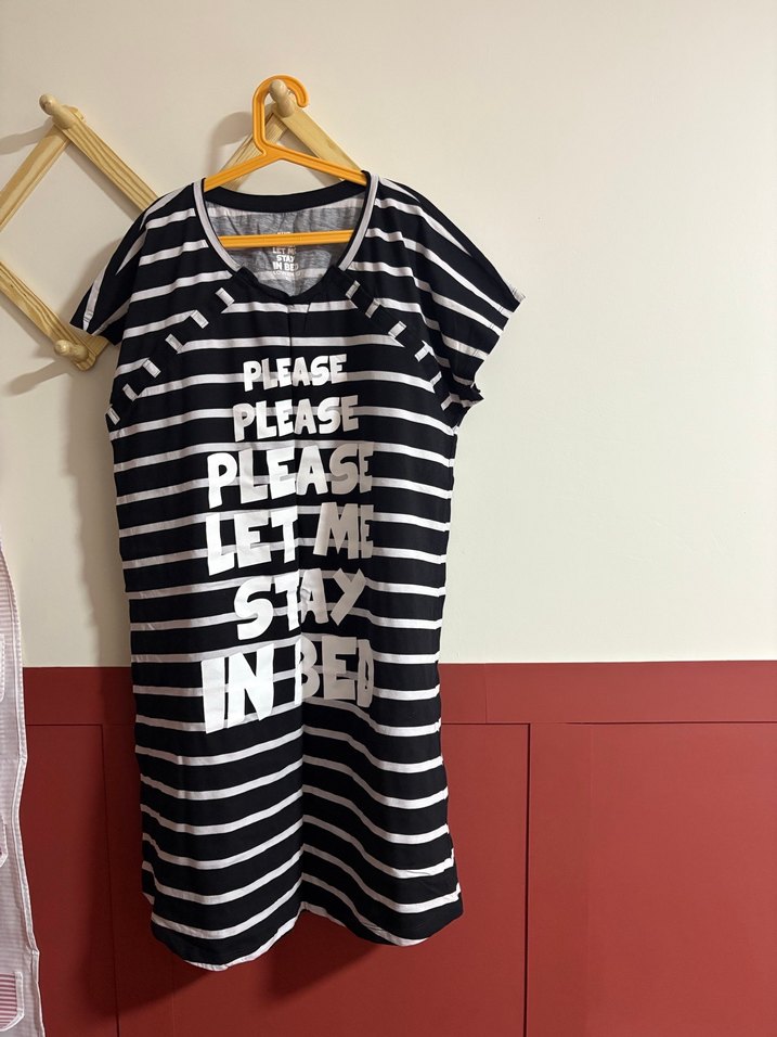emzirme yeri çıtçıtlı Siyah çizgili hamile elbisesi, rahat kesim, kısa kollu ve kayık yaka. Üzerinde renkli baskılar ve pilili detaylar bulunur. Önde "PLEASE PLEASE PLEASE LET ME STAY IN BED" yazısı vardır.