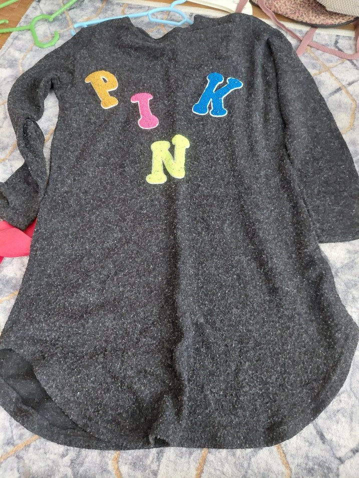 Yumuşak ve sıcak kumaştan, rahat kesim uzun kollu, bisiklet yaka gri hamile kazağı. Renkli "PINK" baskılı, uzun boylu, rahat ve şık bir seçenek.