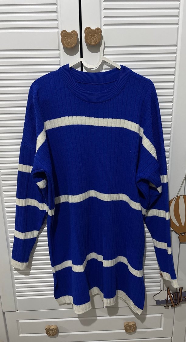 Rahat kesim, uzun boy mavi ve beyaz çizgili kadın kazak. Uzun kollu, yuvarlak yakalı, yumuşak örme kumaştan, günlük rahat sokak stili için uygundur.