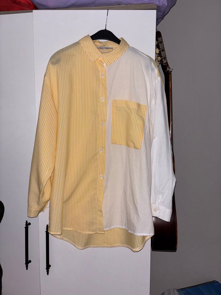 Açık sarı ve beyaz kumaştan, yakalı, düğmeli, rahat kesim uzun kollu gömlek. Günlük rahat sokak stili için uygun.