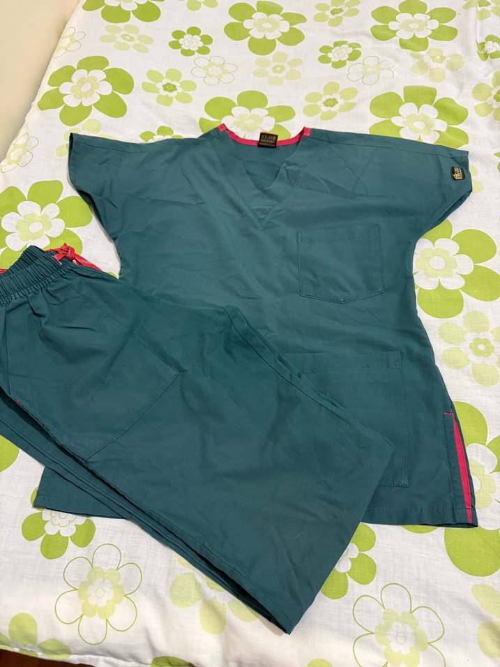 Yeşil renkte, kısa kollu ve V yaka rahat kesim iş takımı Üst ve midi boy pantolon rahat kumaştan. Keten dokusu mevcut. Hastane revir için uygun. Ölçüleri görselde mevcuttur