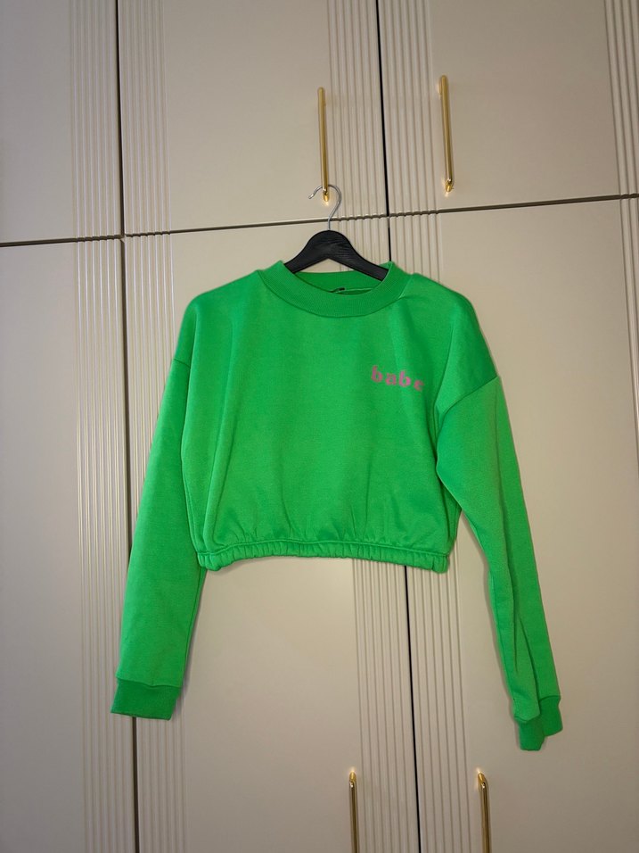 İçi polarlı çok sıcak tutuyor bir iki kere kullandım Yeşil renkli, uzun kollu ve crop kesim rahat sweatshirt. Yumuşak kumaştan, renkli baskılı ve günlük kullanıma uygun şık bir parça.