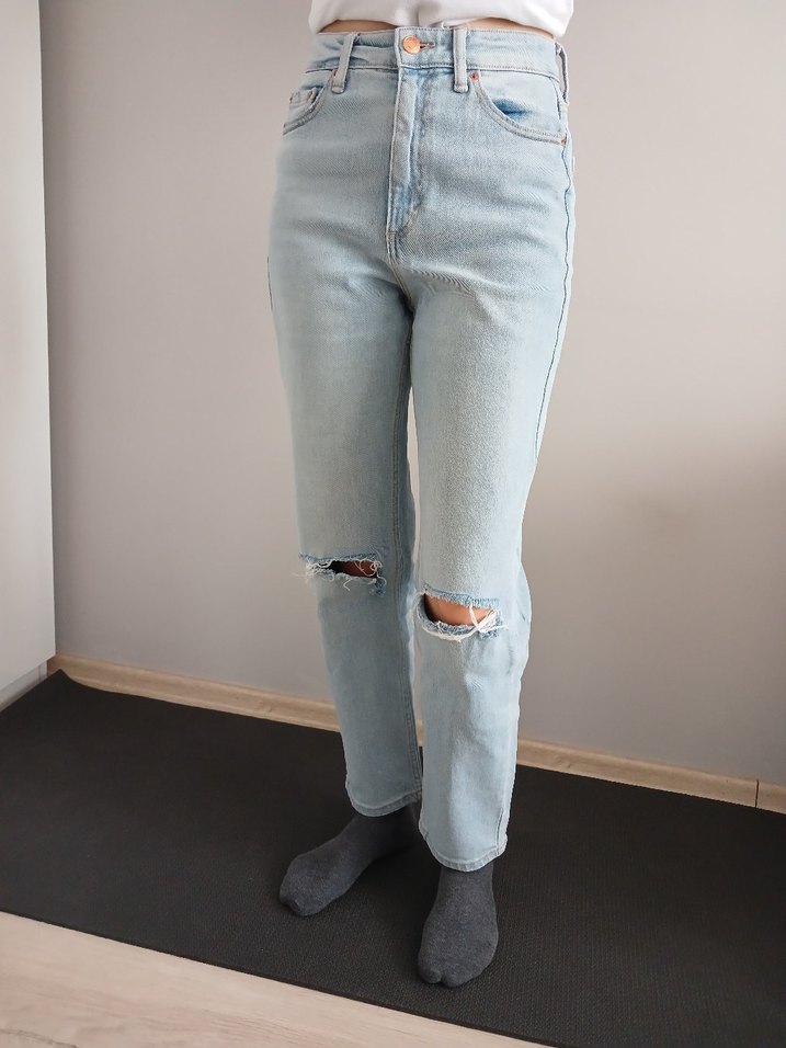 Yırtık diz detaylı, rahat kesim denim kot pantolon. Günlük kullanıma uygun, hafif mavi renkte, sade ve şık görünümlü.