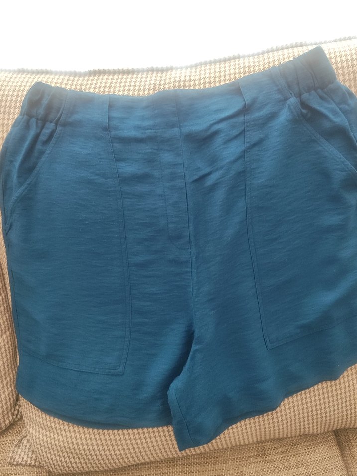 Rahat kesim, koyu mavi keten şort. Midi boy, günlük kullanıma uygun sade ve şık tasarım.