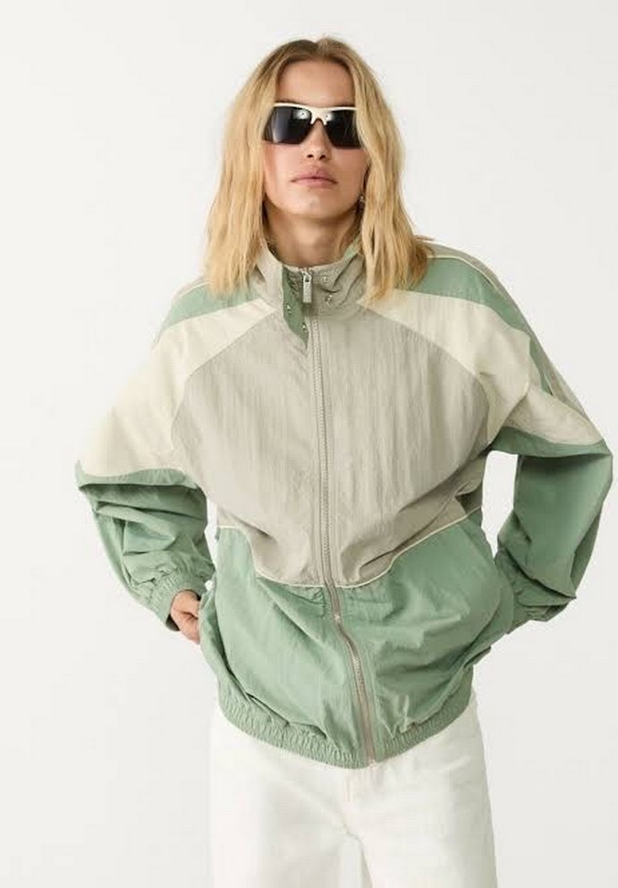 Rahat kesim, yüksek yakalı ve uzun kollu kadın spor ceketi, pastel yeşil tonlarda sentetik kumaştan üretilmiştir. Midi boyu ve sade tasarımıyla günlük kullanımda şıklık sağlar. Sayılı giydim