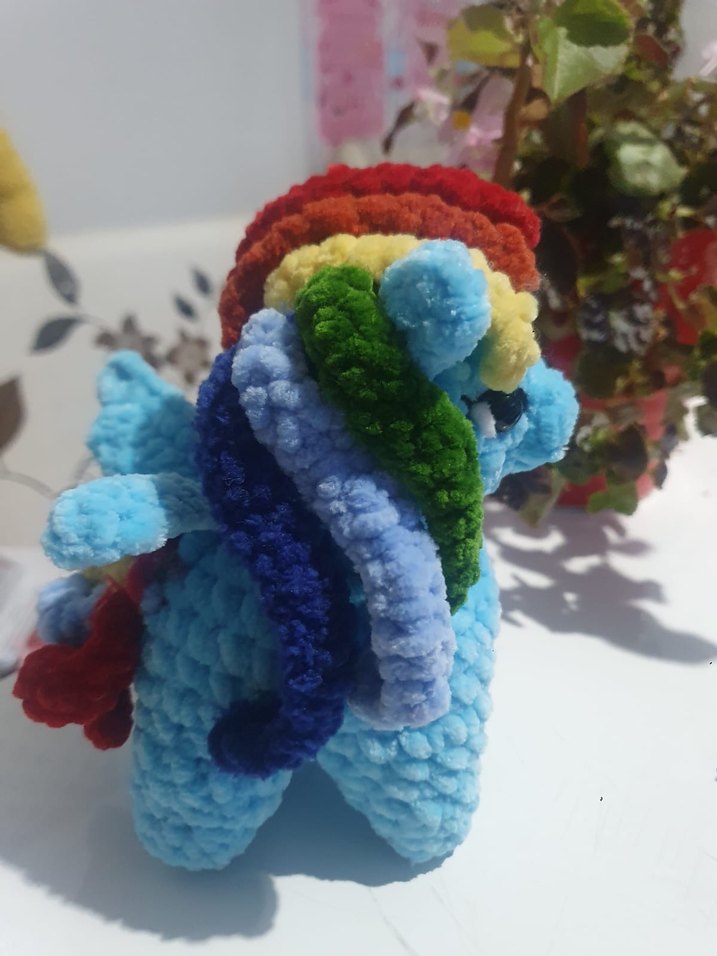 Yumuşak dokulu, canlı renklerde gökkuşağı detaylı küçük peluş at oyuncak. Sarılmak için uygun, renkli ve yumuşak kumaş kullanılmış.