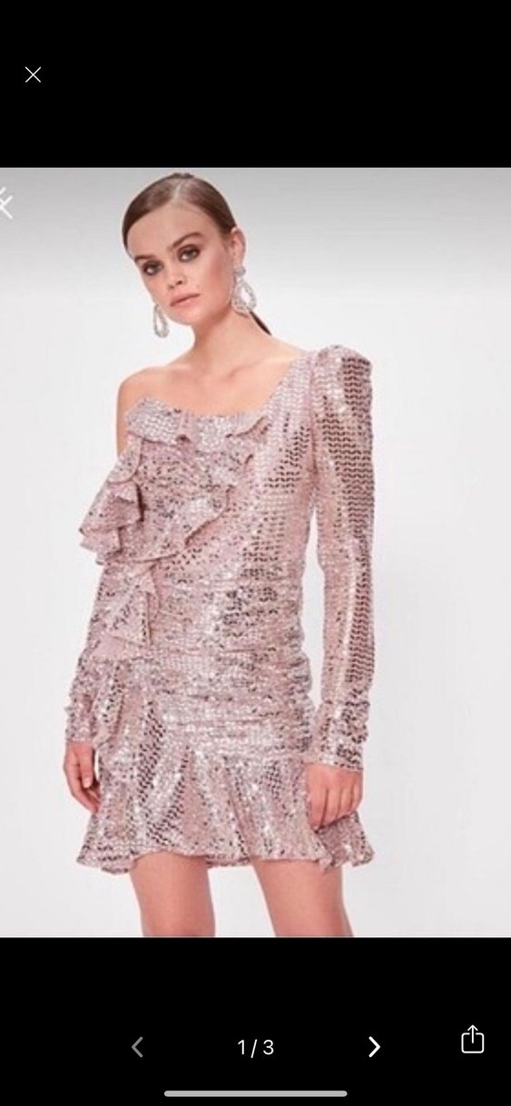 Pembe yılan desenli payetli, asimetrik straplez ve uzun kollu, vücuda oturan gece elbisesi. Parti için şık ve çağdaş bir tercih. ✨
