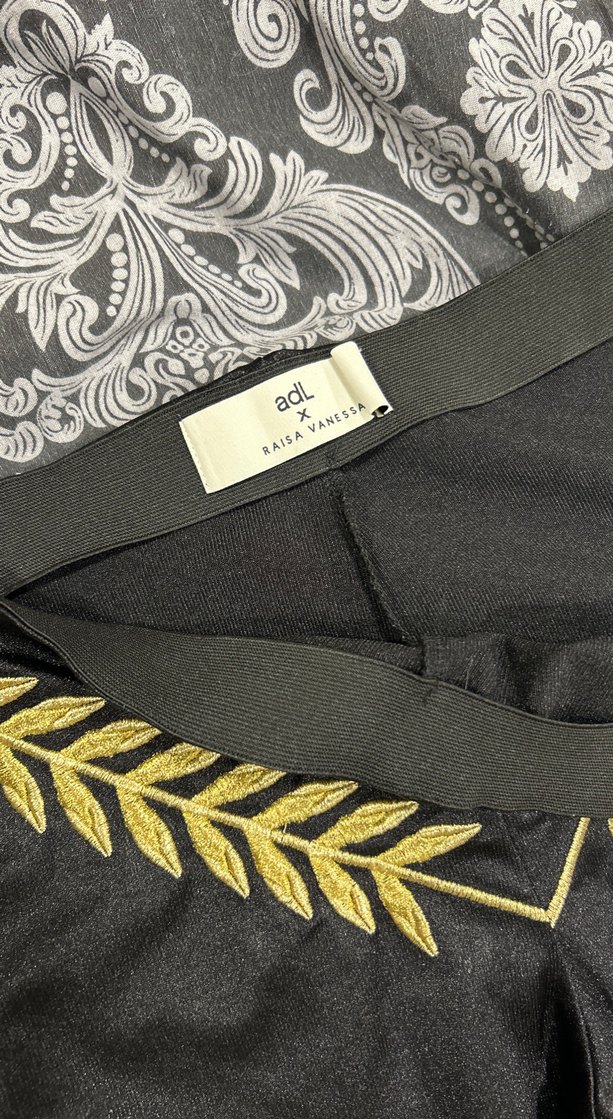 Kadınlar için sentetik kumaştan, altın nakışlı ve düğmeli, bol kesim midi uzunluğunda kumaş pantolon. Sokak stiline uygun, marka: adl. ✨