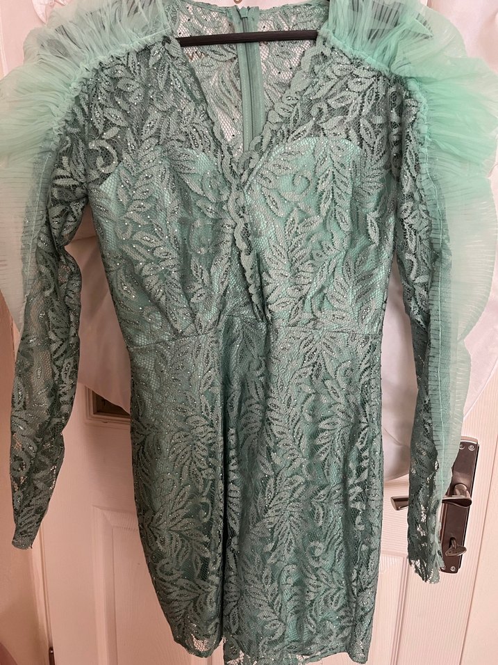 Dantel kumaş ve yılan desenli, V yaka uzun kollu, vücuda oturan turkuaz elbise. 1 kez giydim. Göğüs dekoltesini kapatmak için kendim dikiş yaptım istenirse sökülebilir.
