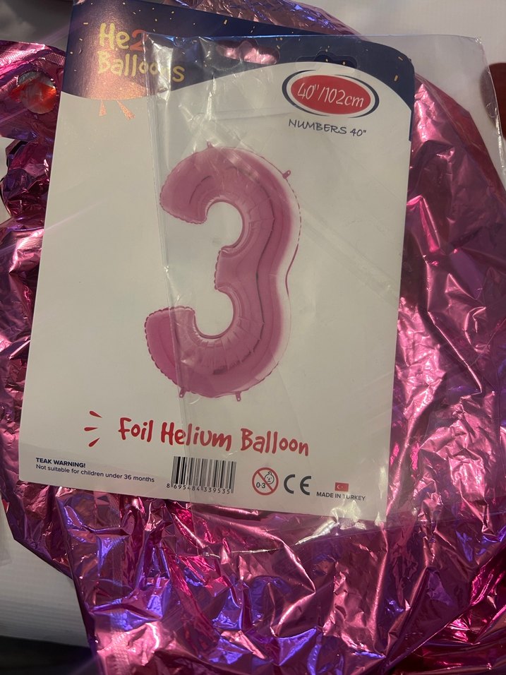 102 cm boyunda, pembe renkte folyo helyum balon, rakam 3 şeklindedir. Parti süslemeleri için uygundur.