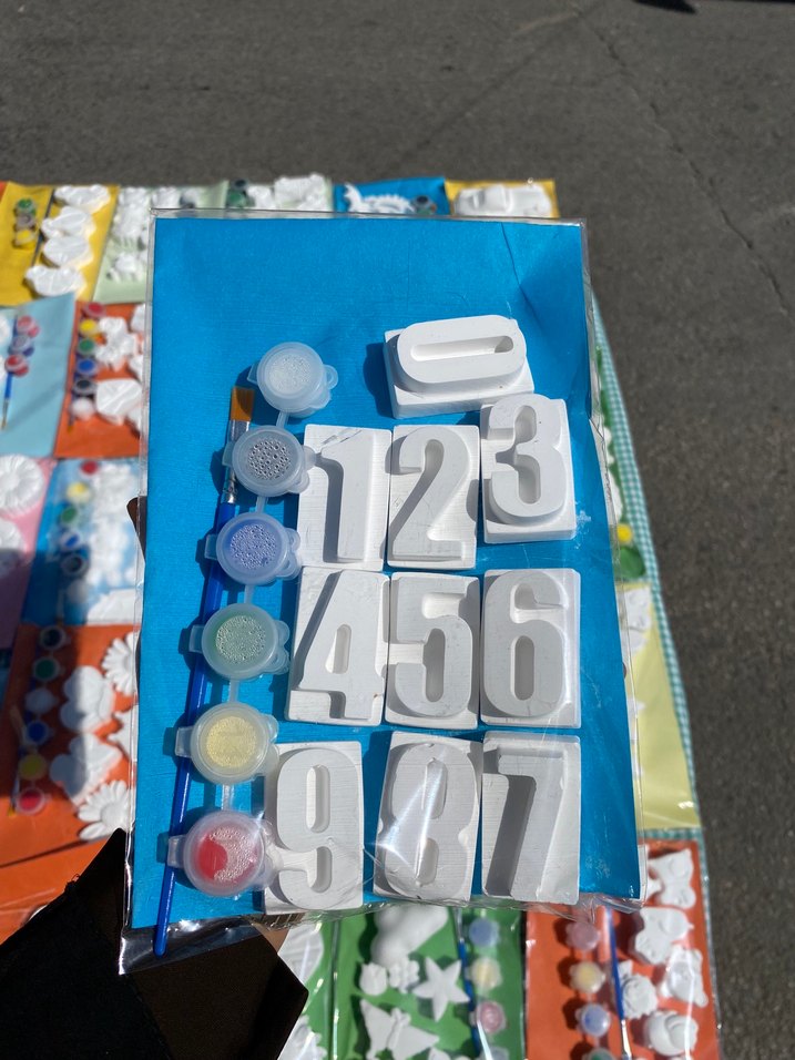 1'den 9'a kadar beyaz rakam kalıpları, bir fırça ve altı küçük boya kabı içeren boyama seti