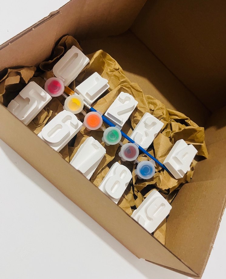 Beyaz boyanabilir rakamlar ve kırmızı, sarı, yeşil, mavi, turuncu gibi renklerde küçük boya kapları içeren, fırça ile birlikte gelen rakamlı boyama seti.