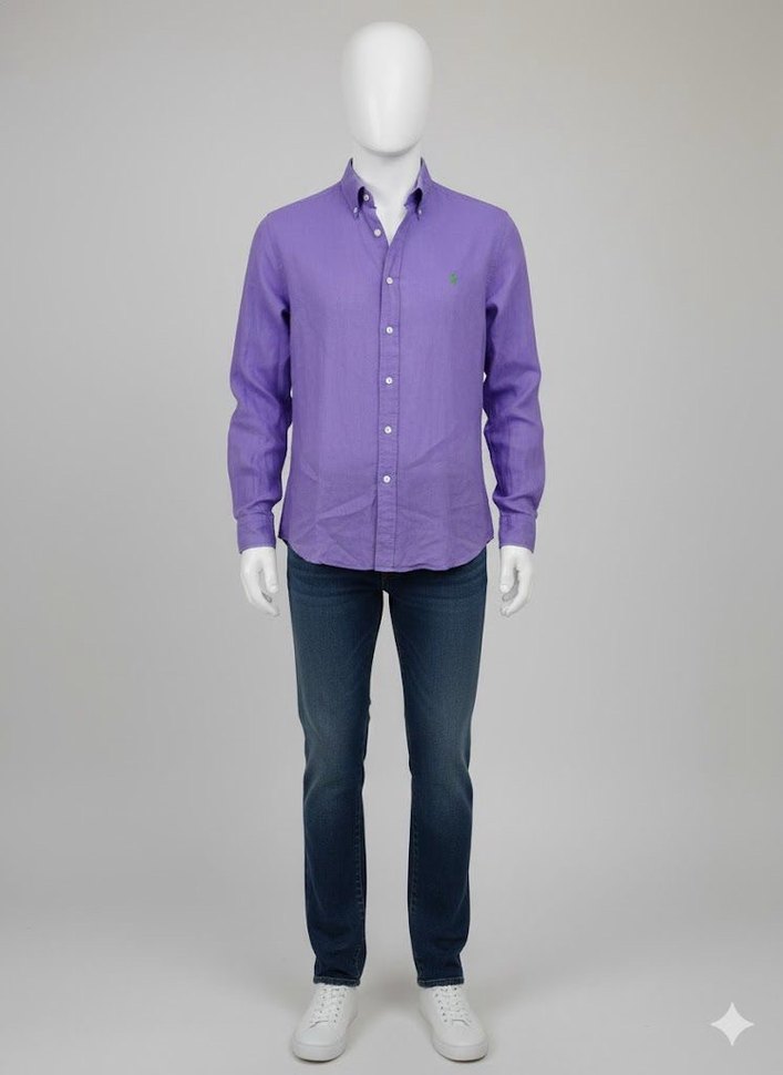 Mor renkte, düğmeli ve uzun kollu erkek denim gömleği. Normal kesim ve notlu yaka detayına sahip, günlük ve sokak stiline uygun.