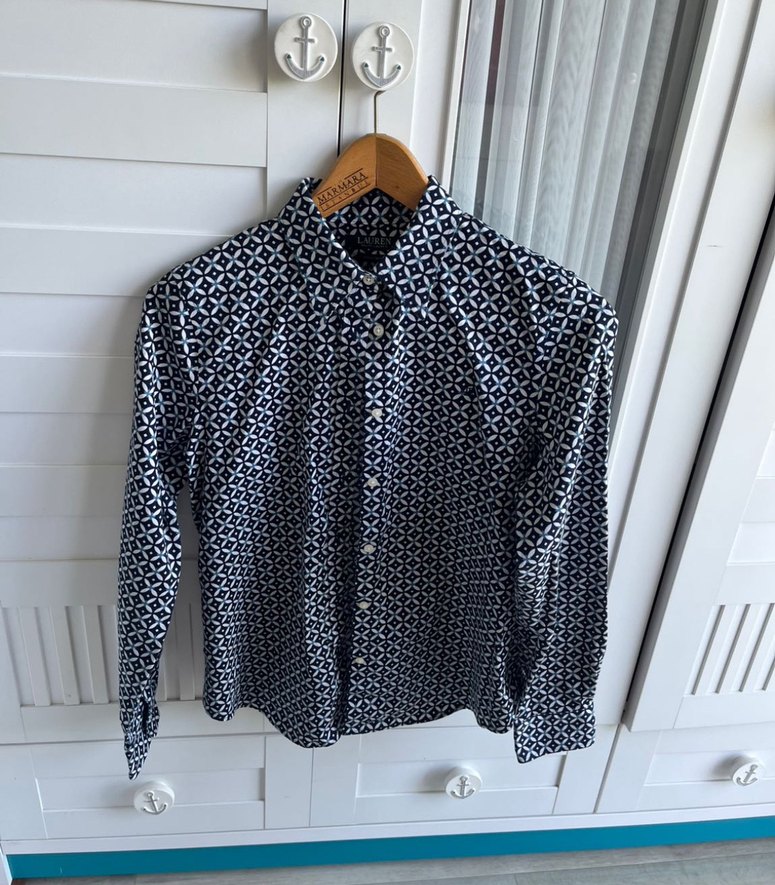 Pamuk kumaştan, düğmeli, uzun kollu, lacivert desenli gömlek. Normal boyda, regular fit, ofis ve gündelik kullanıma uygun. Orijinal, Amerika’dan. Ütü gerektirmeyen kumaş.