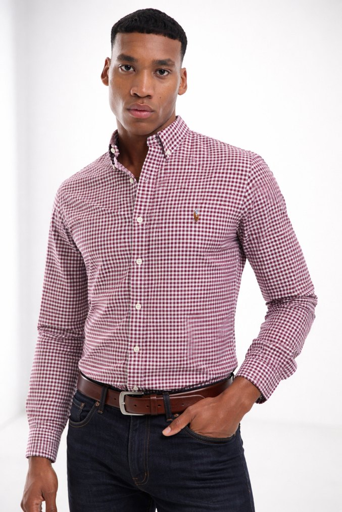 Bordo renginde, regular fit, uzun kollu erkek gömlek. Pamuk kumaştan, düğmeli ve hafif kareli desene sahip, ofis ve sokak stiline uygun. Amerika’dan, orijinal.