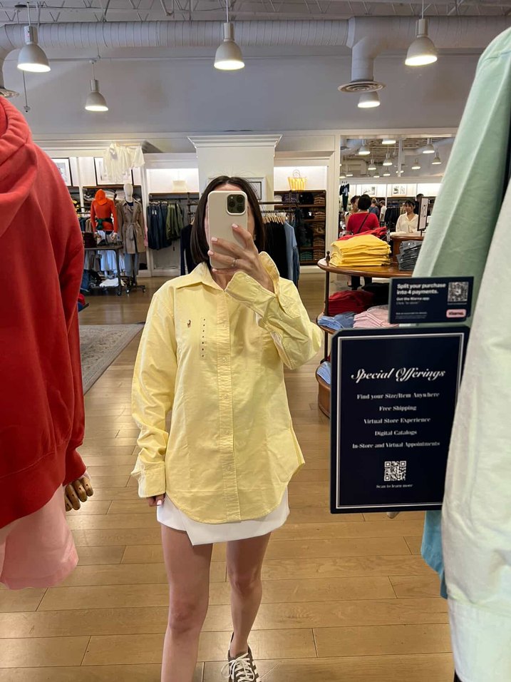 Sarı pamuk gömlek, uzun kollu ve salaş kesimdir. Günlük kullanıma uygun, hafif ve rahat bir şıklık sunar.