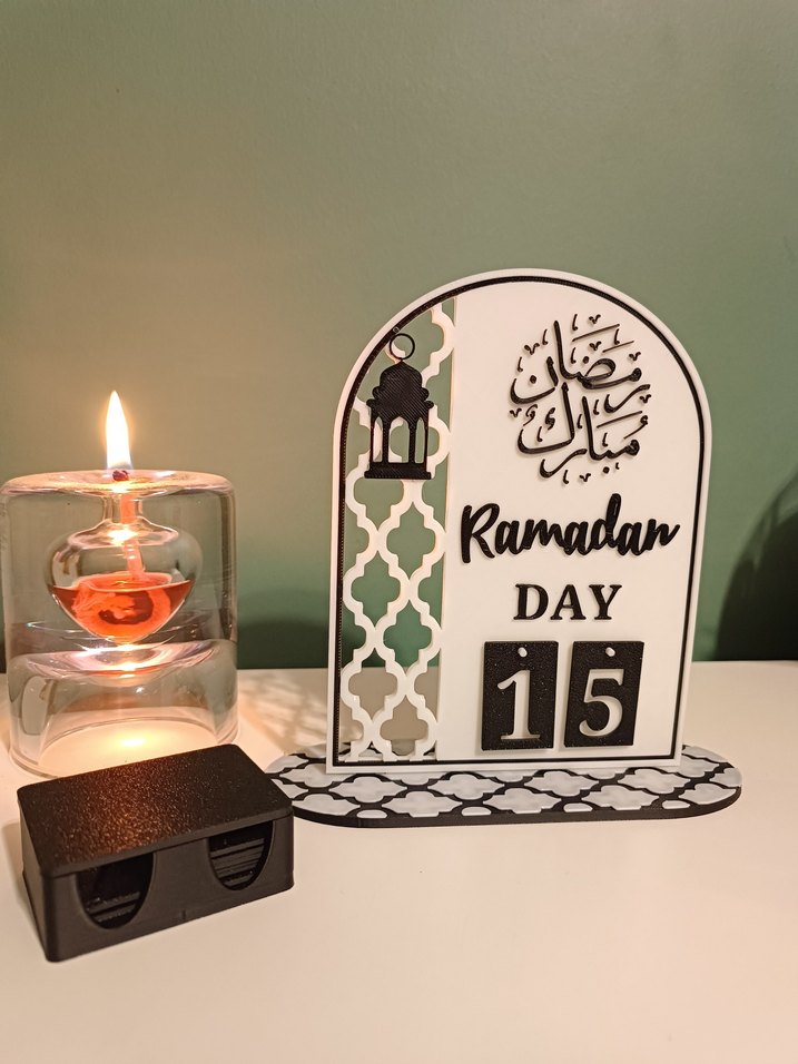 Beyaz masa dekoru, Ramazan Günü 15'i gösterir, fener ve Arapça kaligrafi tasarımı bulunur. Küçük siyah kutu ve yanan mum eşlik eder. ️
