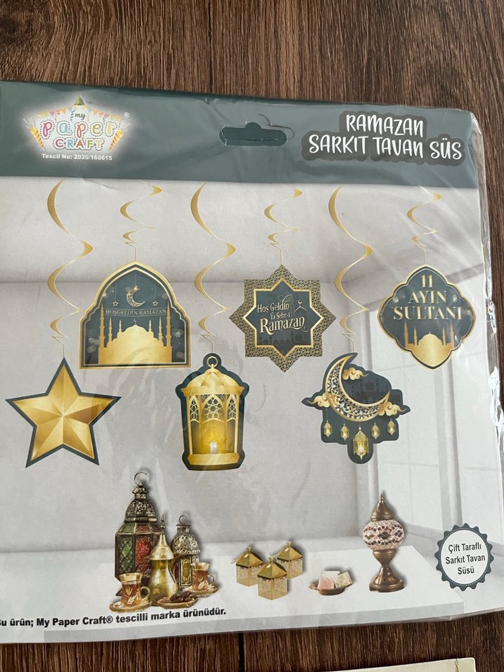 Altın renkli, Ramazan temalı yıldız, fener ve hilal figürlü sarkıt tavan süsleri.