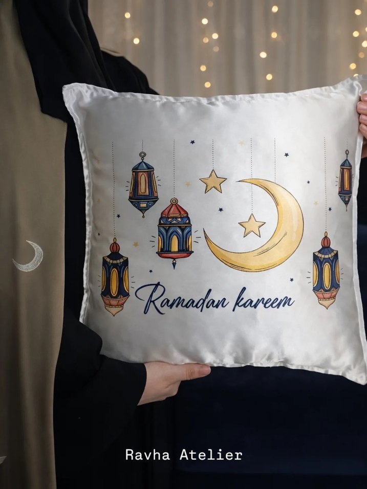 Bohem tarzda, beyaz zemin üzerine baskılı fener, yıldız ve hilal figürleri ile "Ramadan kareem" yazılı dekoratif yastık. Ravha Atelier imzalı. ️