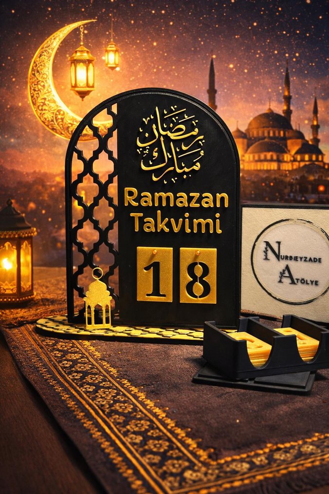 Osmanlı hat sanatıyla süslenmiş Ramazan takvimi, klasik tasarım ve sıcak ışıklandırmayla tarihi gösterir. Nurbeyzade Atölye kutusu dahil. 3d yazıcı makinasıyla üretilmiştir