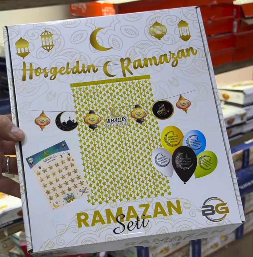 Ramazan temalı, süslemeler, balonlar ve takvim içerir, kutlama için uygundur.