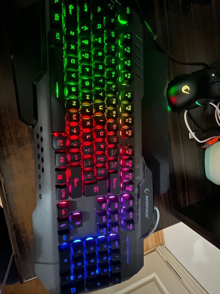 RAMPAGE marka çok renkli ışıklı mekanik klavye, tam tuş dizilimine ve ayarlanabilir ışık efektlerine sahiptir.