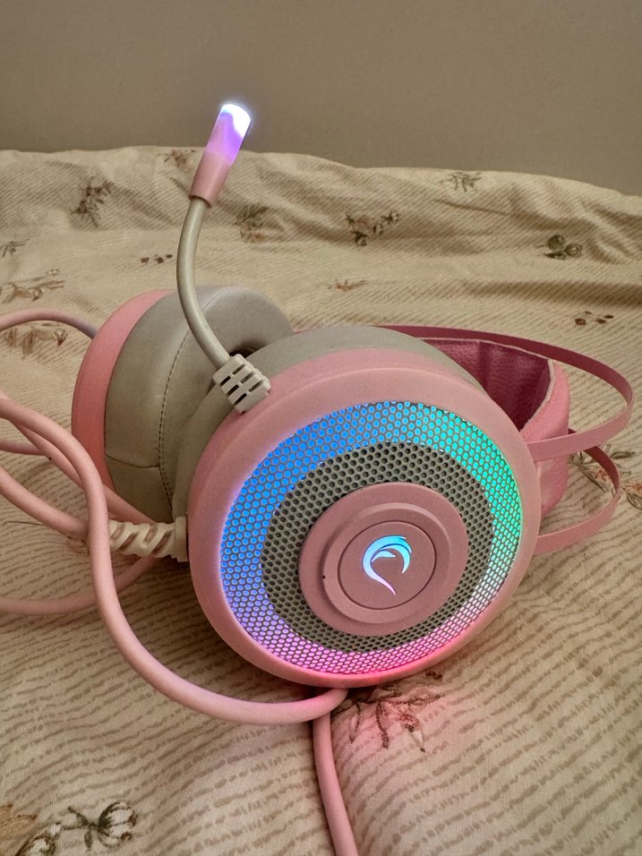 Yumuşak kulak yastıkları ve esnek, ışıklı mikrofonu olan pastel pembe gaming kulaklık,aşırı rahat ses kalitesi mükemmel,heves edip almıştım ama oyun oynamıyorum aldığımdan beri 1 defa kullandım kutusunda duruyor tertemiz