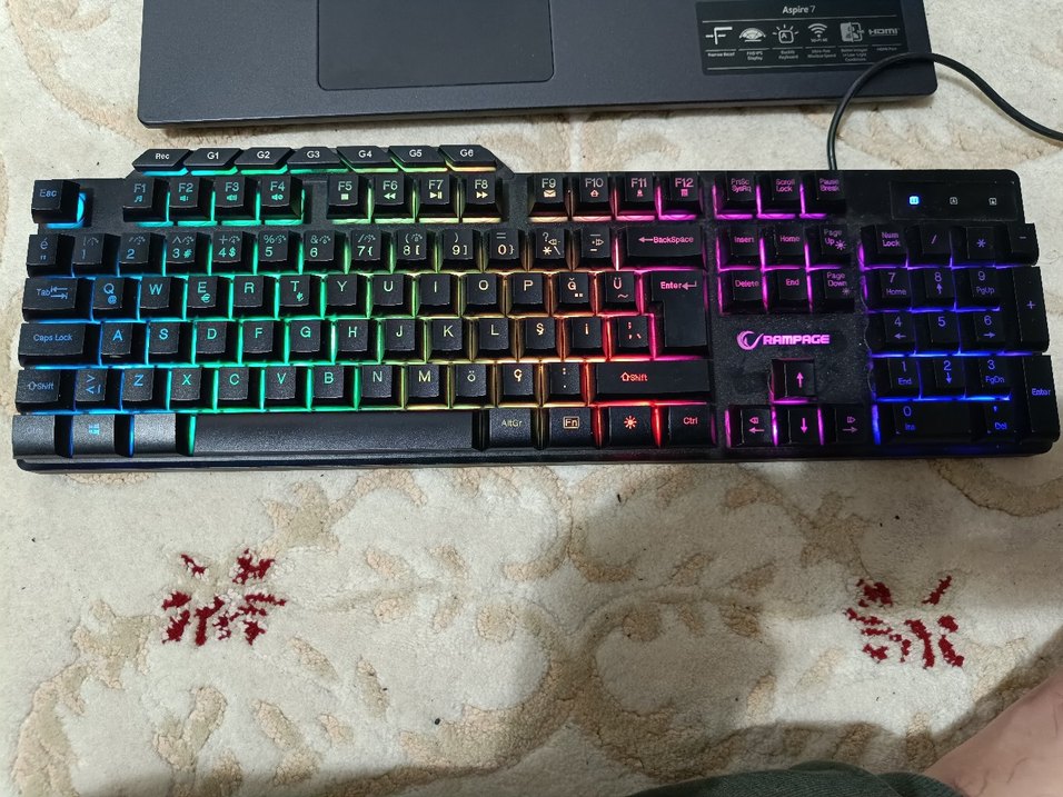 Bu koyu renkli klavye, çok renkli RGB aydınlatmaya ve oyun için özel tuşlara sahiptir. Türkçe karakterler ve fonksiyon tuşları bulunur.