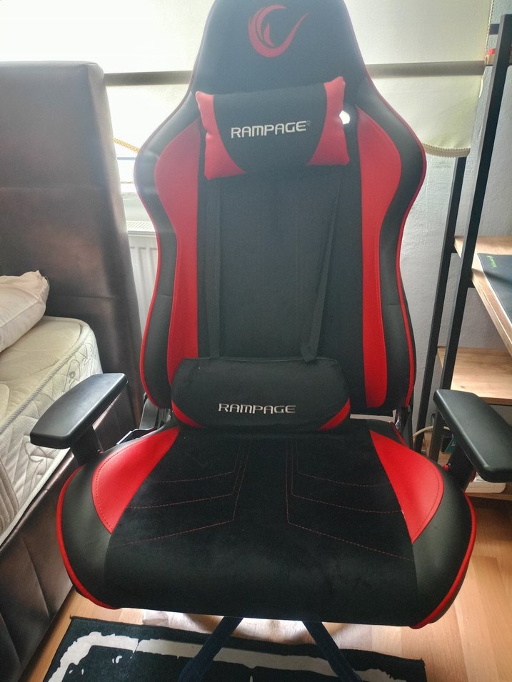 Rampage marka siyah ve kırmızı renkli, ergonomik tasarımlı, ayarlanabilir kollu ve bel destek yastıklı oyuncu koltuğu.