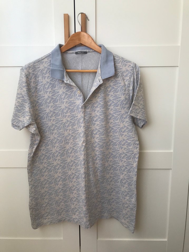 Nefes alabilen kumaştan üretilmiş, düğmeli ve hafif desenli, bol kesim gri mavi erkek kısa kollu polo tişört. Rahat ve günlük sokak tarzı için uygun.