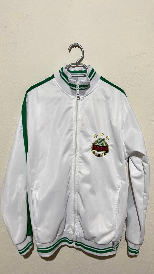 Parlak beyaz ve yeşil şeritli, fermuarlı, nakışlı erkek çocuk ceketi. Yumuşak ve sıcak kumaştan, dar kesim, bisiklet yaka.
