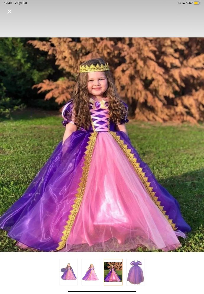 Mor ve pembe renklerde ve dantelli detaylara sahip, sentetik kumaştan yapılmış, renkli baskılı desenli, bohem ve retro tarzda kız çocuk elbisesi. Sorunsuzdur, tarlatansız gönderilecektir. Tacı ve pelerini bulunur.