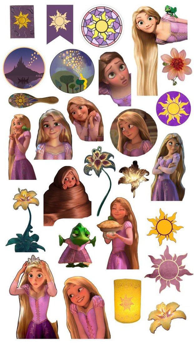 Rapunzel'in farklı pozlarda yer aldığı, çiçek ve güneş motifleri içeren açık mor animasyon figürlerinin stickerları