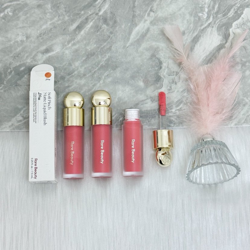 Rare Beauty markasına ait, altın detaylı kapaklı, yumuşak pastel pembe sıvı allık. Ambalajda marka adı belirgindir.
