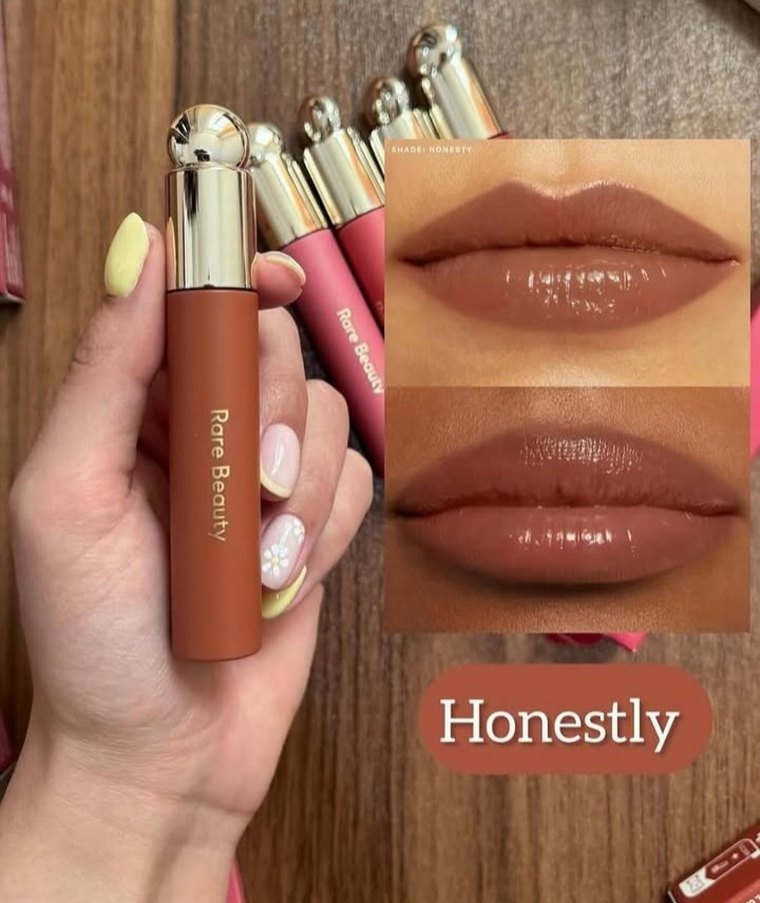 Rare Beauty markasının Honestly isimli dudak parlatıcısı, pastel bej tonunda parlak ve doğal görünümlü dudaklar sağlar. Pürüzsüz dokusu dudak rengini hafifçe artırır.