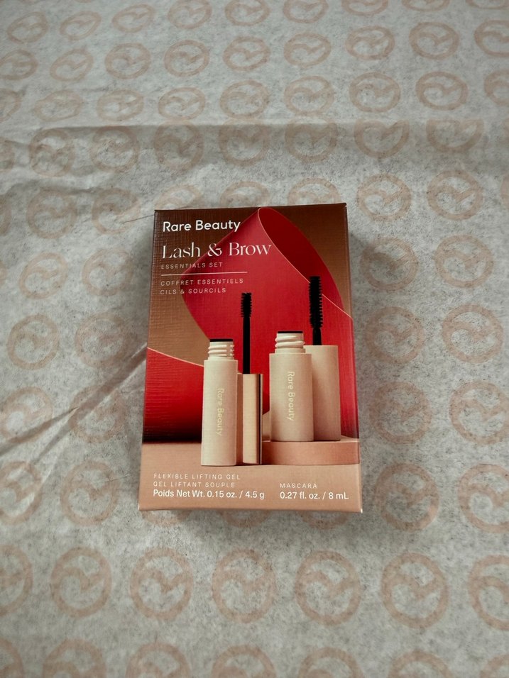 Rare Beauty Lash&Brow set, kirpik ve kaşlar için esnek kaldırıcı jel ve maskaradan oluşur, açık bej renktedir. ️