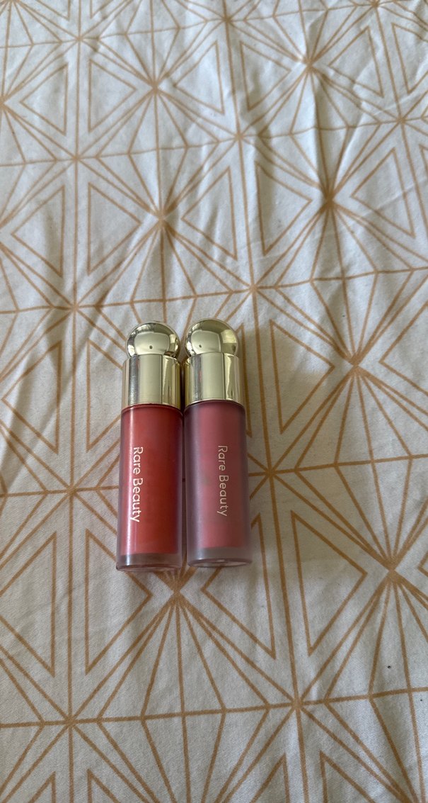 Rare Beauty markasına ait parlak kırmızı tonlarda, pürüzsüz uygulama ve canlı bitişli allık. Altın renkli kapağa sahip şık ambalaj. İki allık biri joy biri bliss