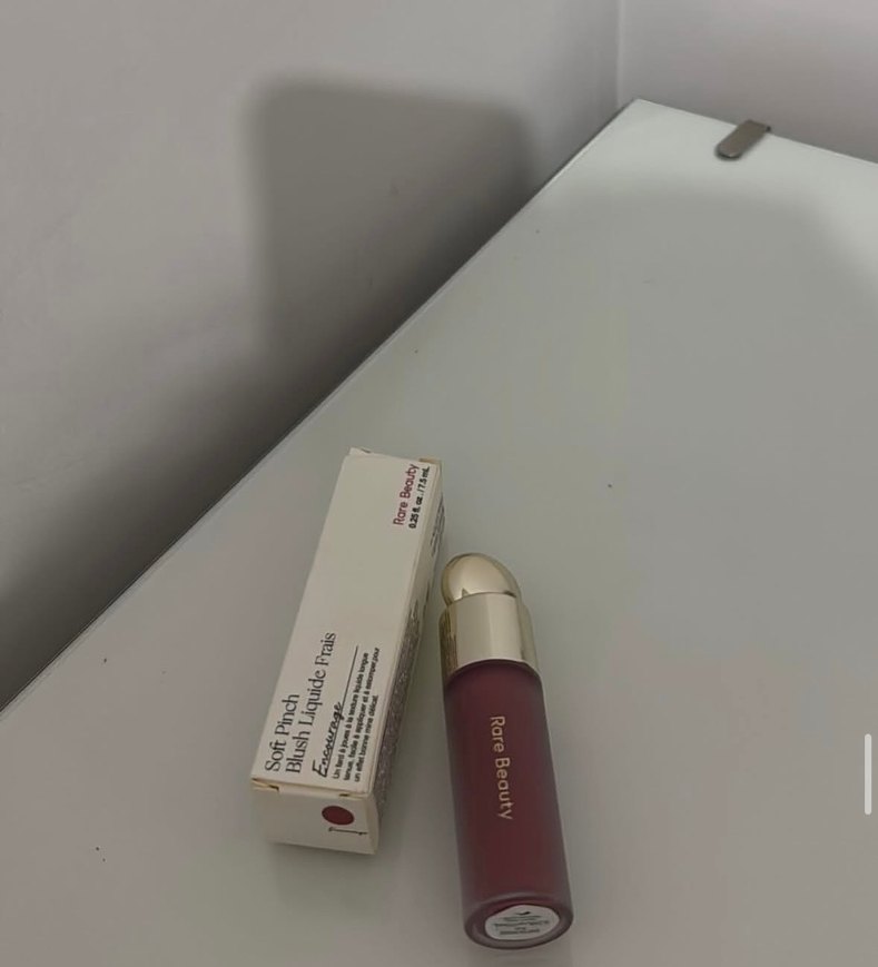 Rare Beauty markasına ait pastel bordoya yakın likit yapıda allık. Altın kapaklı şık şişede sunulur.
