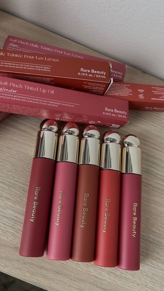 Rare Beauty Soft Pinch Tinted Lip Oil, pastel bordo tonunda, hafif ve besleyici formülüyle dudaklara yumuşak renk ve parlaklık verir.