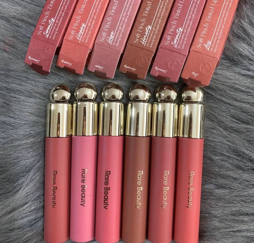 Rare Beauty pastel pembe dudak parlatıcıları, yumuşak renk tonu ve şık altın kapaklı. Farklı tonlarda parlak ve pürüzsüz görünüm sağlar.