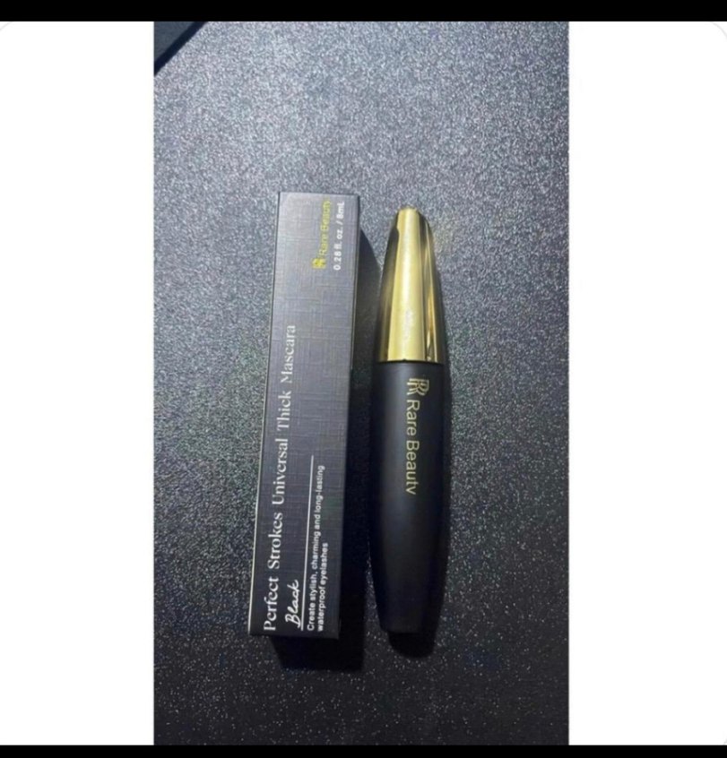 Parlak siyah renkte, kalın ve belirgin kirpikler için Rare Beauty maskara. Şık siyah ve altın kapaklı tüpte.