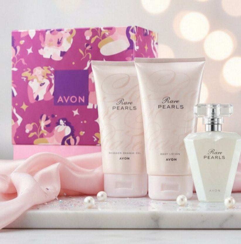 Avon Rare Pearls set, parfüm, vücut losyonu duş jeli içerir. Zarif kokusu ve pembe süslü kutusuyla sunulur. manolya, inci miski ve sandal ağacı kokuludur. jelantili kutusu ile teslim edilir.
