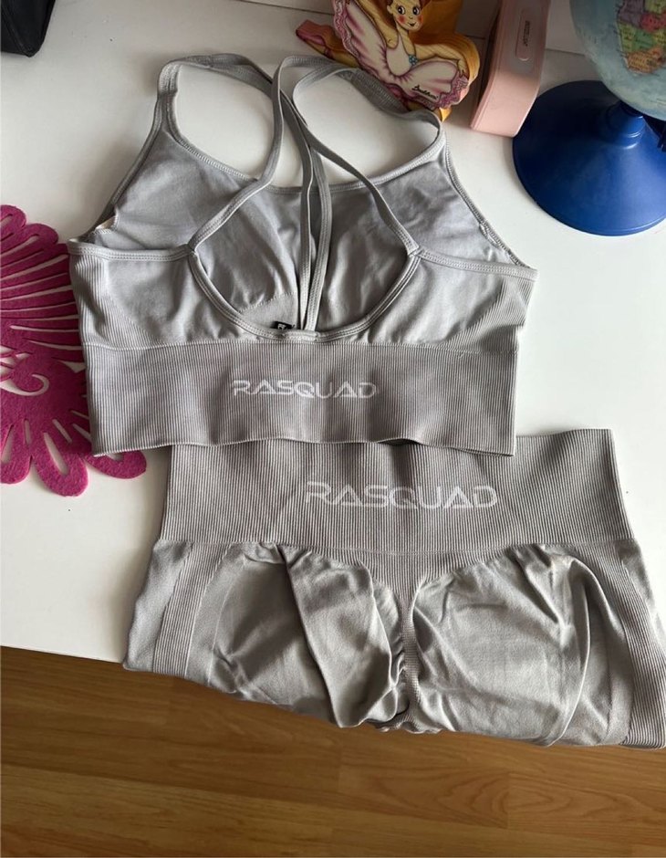 V yaka, askılı, gri mini spor takım. Yumuşak sentetik kumaştan, baskılı ve 'RASGUAD' yazılı, sokak stiline uygun. Etiketi L dir fakat kalıp dar olduğu için M beden uyumludur