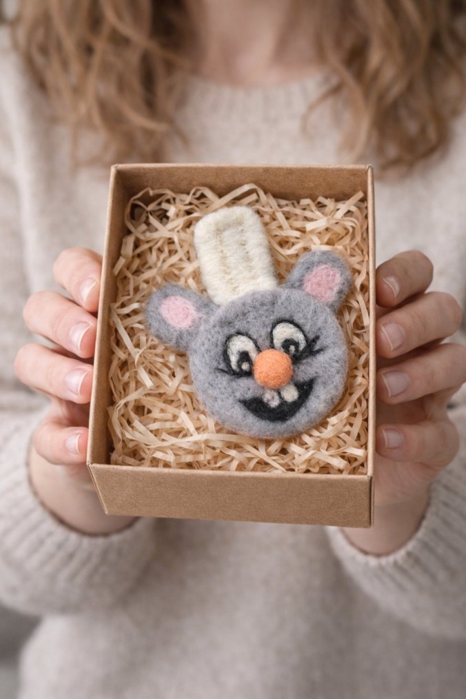 Yumuşak keçe malzemeden yapılmış, gülen fare şeklinde broş