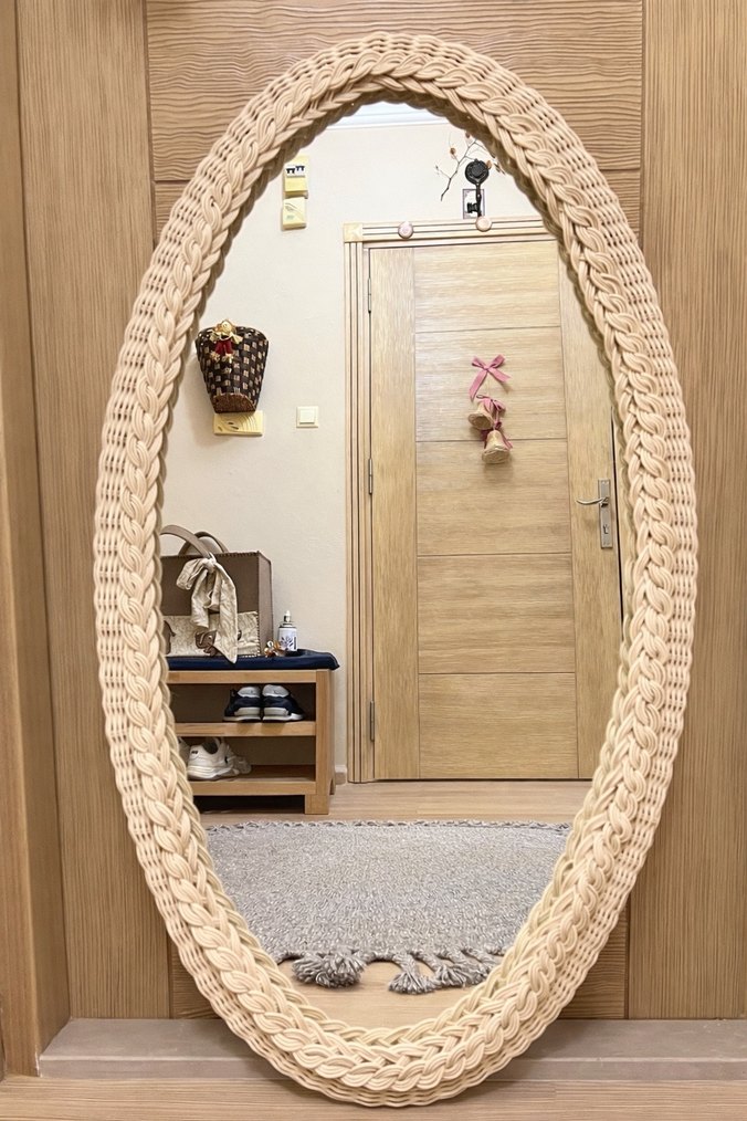 Bej örgü desenli çerçevesiyle doğal ve dokulu görünüme sahip oval ayna.